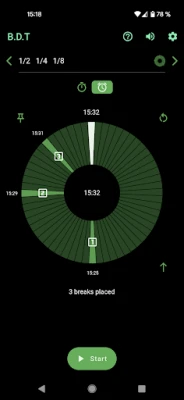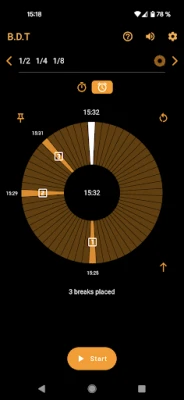 This is a handy timer where you can define notifications ("breaks") while the timer is running. Imagine this scenario: You have 45 minutes time to go for a walk, so you should go back after the half of the time. So, set the timer duration to 45 minutes, define a break after the half of the time and start the timer. Now you get a notification (audio signal, vibration, device notification) when the half of the time is reached, AND of course when the complete time is reached.