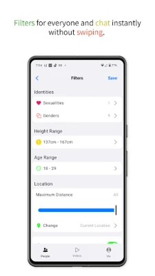 - 2-way filter - Allows you to filter for people who are also filtering for your gender, sexuality, age, and height.