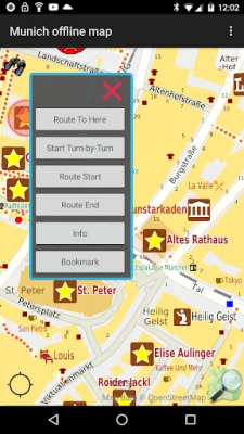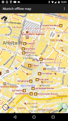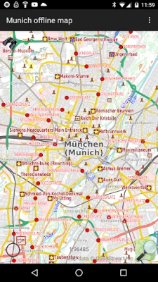 Offline map of Munich, Germany, for tourist & business visitors. Download before you go and avoid expensive roaming charges. The map runs completely on your device; display, routing, search, bookmark, everything. It does not use your data connection at all. Switch your phone function off if you want to!